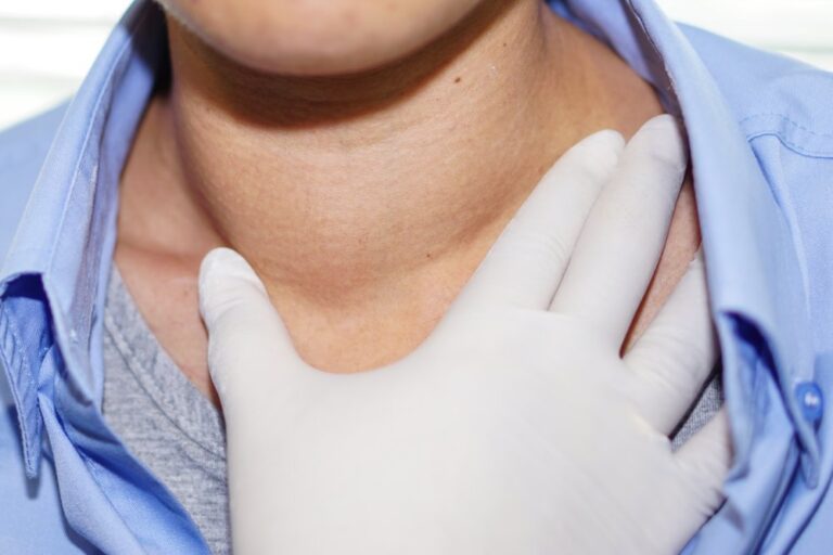 Young beautiful woman suffering from pain in throat, touching inflamed zone on her neck, cropped, empty space, sore throat
